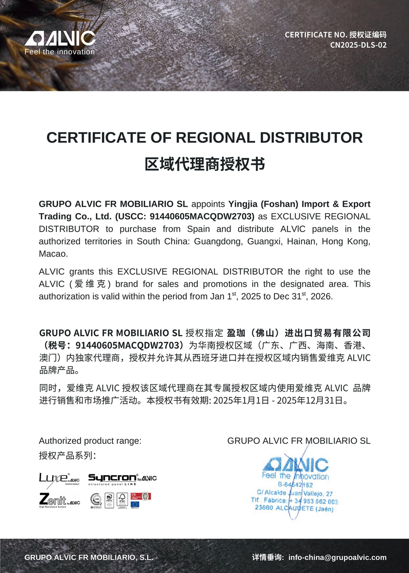 GRUPO ALVIC FR MOBILIARIO SL appoints Yingjia (Foshan)Import & Export Trading Co., Ltd.(USCC: 91440605MACQDW2703)as EXCLUSIVE REGIONAL DISTRIBUTOR to purchase from Spain and distribute ALVIC panels in the authorized territories in South China: Guangdong, Guangxi, Hainan,Hong Kong,Macao.